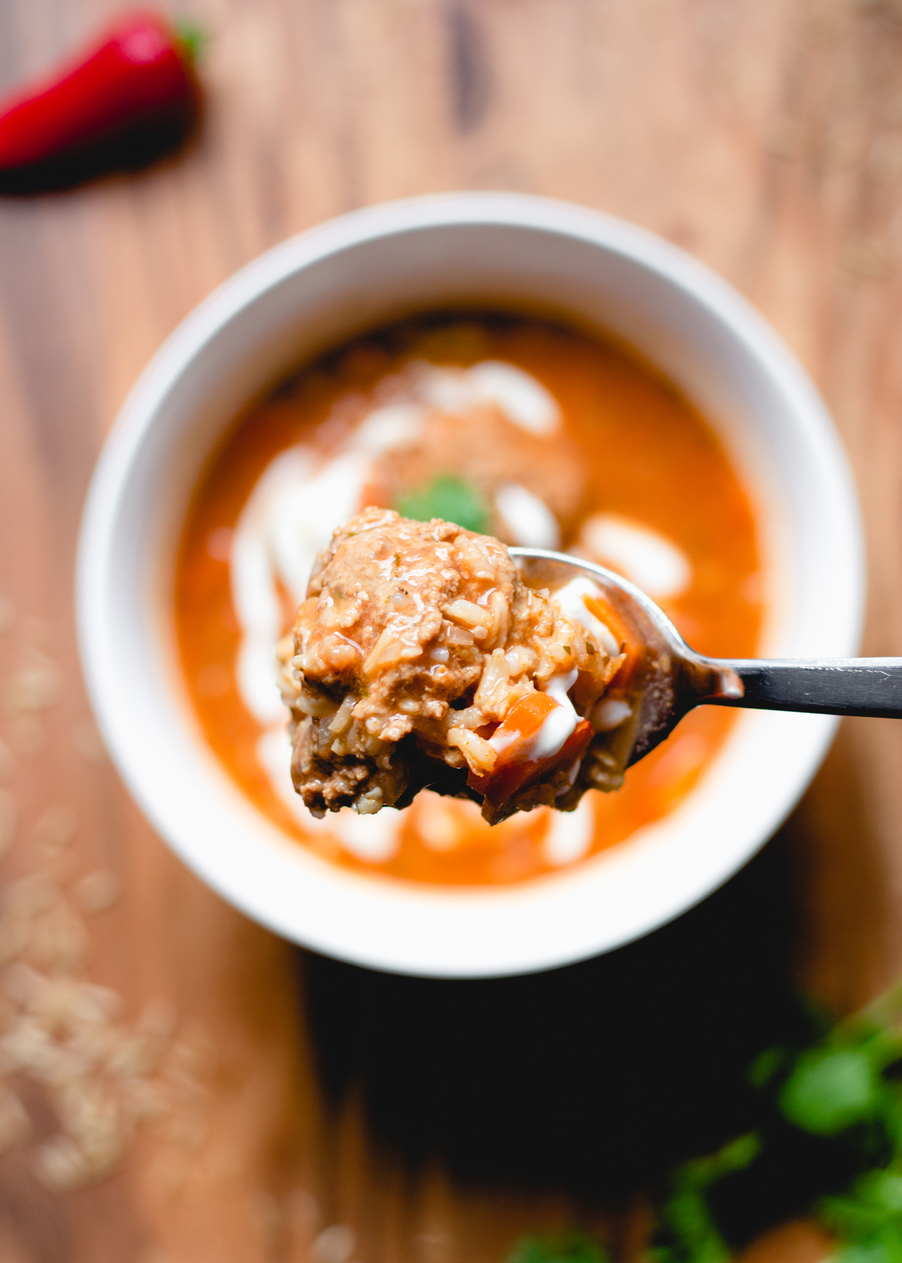 | Ingredients (for soup): 1 tsp olive oil 3/4 finely chopped onion 3 spring onion, finely chopped 3 large clove garlic, minced 2L beef stock (I use stock pots) 3 large carrots, peeled and sliced in circles 1 whole fresh jalapeño (I slice four slits into the side of the jalapeño) 100g long-grain brown rice (uncooked) ¼ tsp dried oregano 250ml tomato passata Sea salt and fresh black pepper |